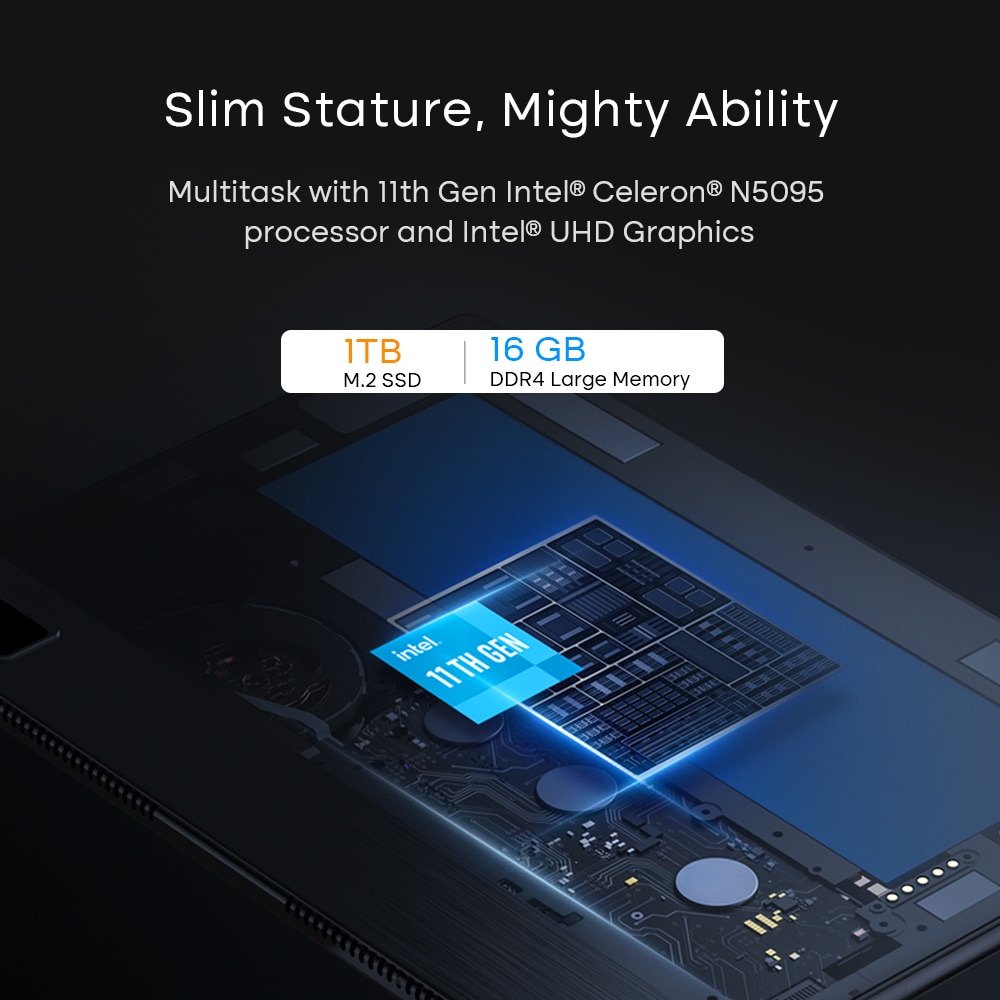 The T30 Pro is powered by the 11th generation Celeron processor N5095, up to 2.9Ghz, along with a 16GB DDR4 memory stick and a 1TB SSD.