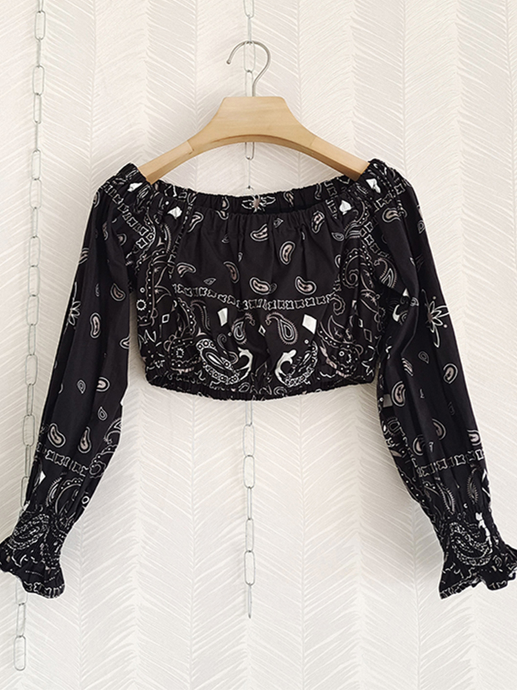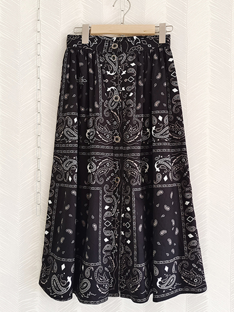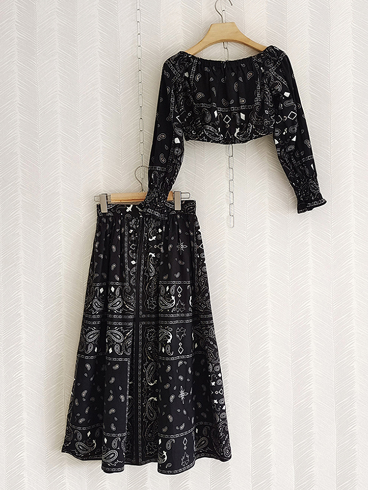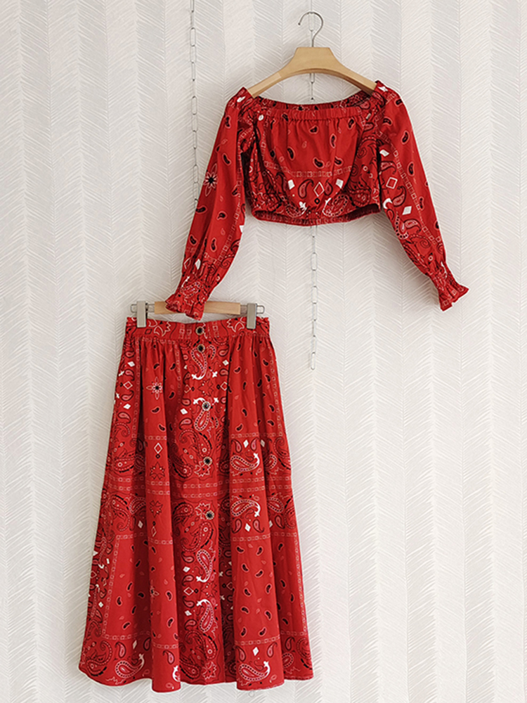 AELESEEN Spring Summer Vintage Elegant 100% Cotton Skirt Suit Women Black Red Printed Short Top + High Waist Full Skirt Holiday