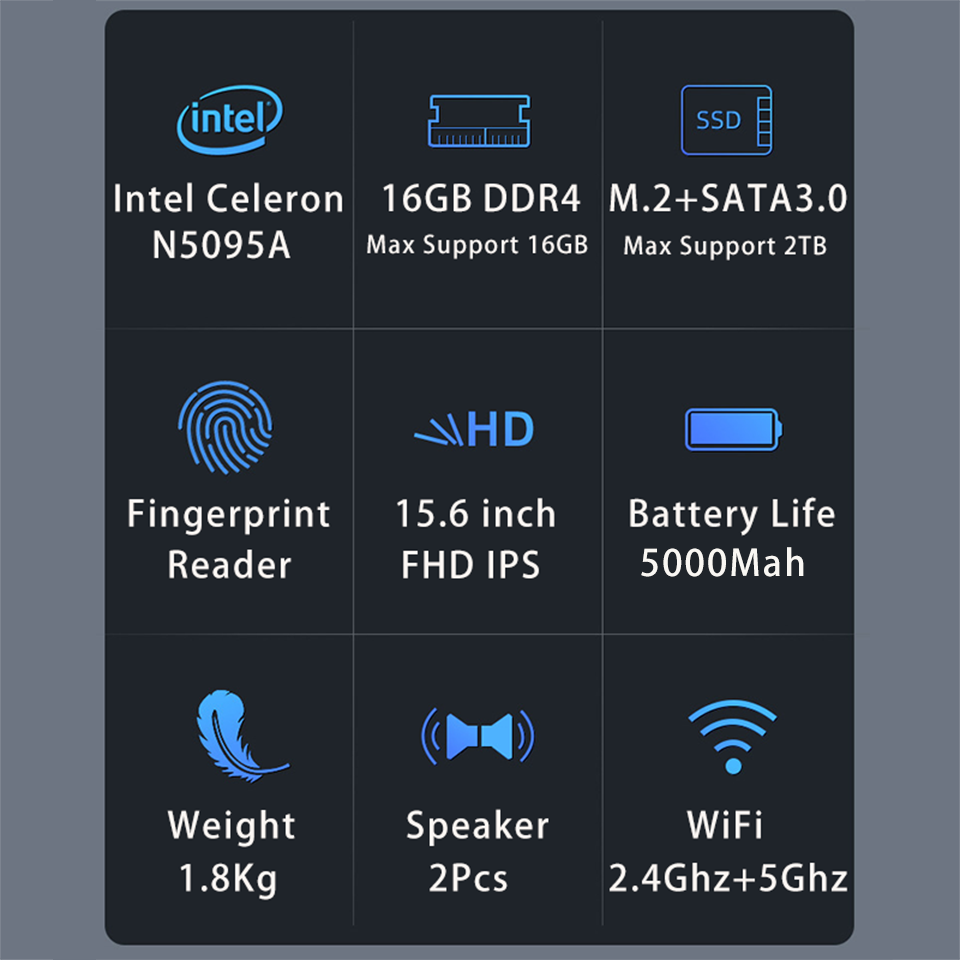 Laptop 15.6-inch 16GB RAM 1TB SSD Intel Celeron N5095 Dual-Band WiFi Business Office Computer Window 10 Notebook