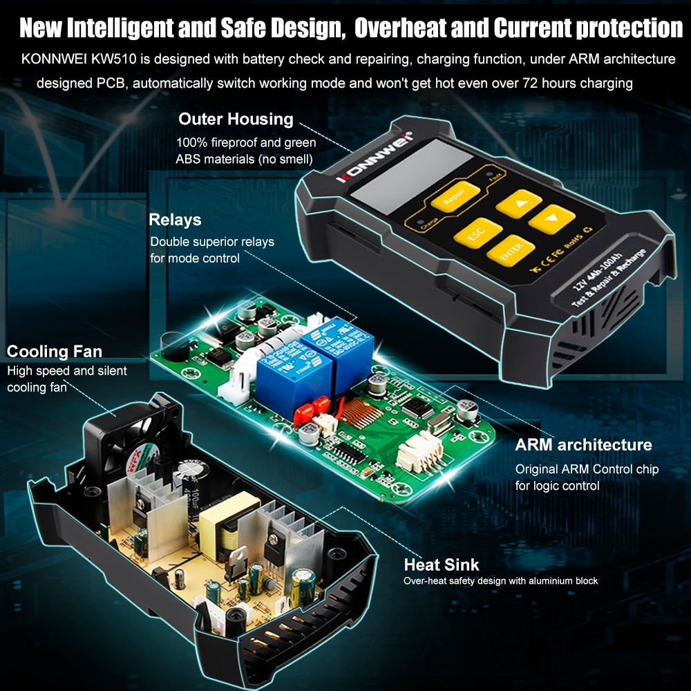 KONNWEI KW850 is designed with battery check and repairing, charging function. Under the PCB designed by ARM architecture, it automatically switches the working mode, and it will not heat up even if it is charged for more than 72 hours.